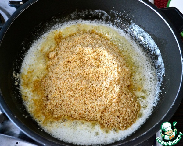 В сковороде с тяжелым дном разогреть сливочное масло и добавить к нему ореховую крошку.