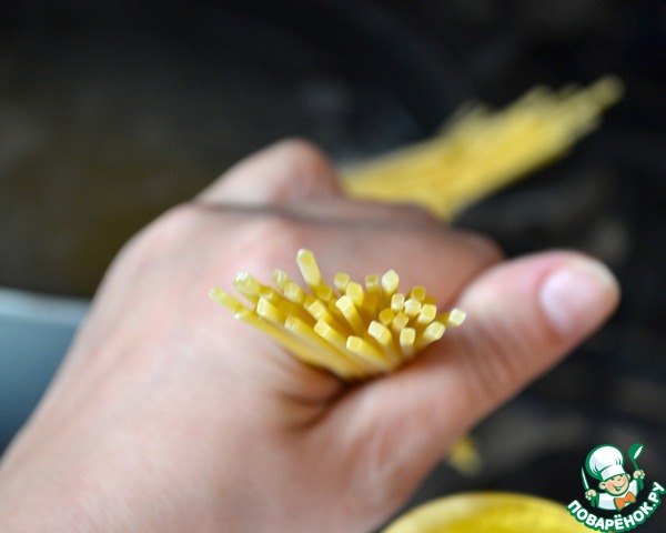 Тем временем в закипевшую подсоленную воду положить отвариваться спагетти или любую другую Вашу любимую пасту! (у меня квадратные спагетти! ))) Отварить согласно рекомендациям производителя...