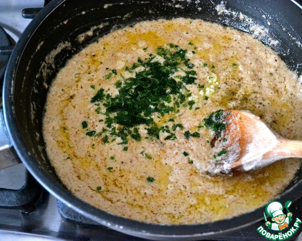 В сковороду к орехам влить сливки и перемешать. В закипающий соус добавить измельченную петрушку, выдавить зубчик чеснока, посолить и поперчить по вкусу! Обжарить все около 3-х минут.