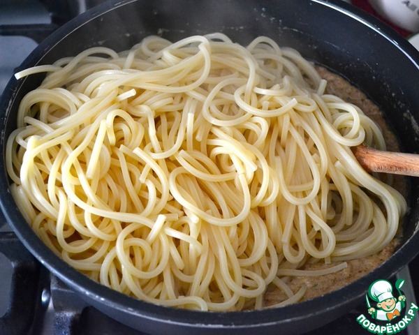 Тем временем, готовую пасту скинуть на дуршлаг (не забудьте предварительно сохранить стакан жидкости от варки спагетти!... Она вам может понадобиться, если соус получится слишком густым, или просто, чтобы добиться желаемой консистенции готового соуса). Выложить спагетти в сковороду с соусом и все как следует перемешать (при необходимости, добавить чуть-чуть оставленной жидкости).