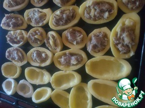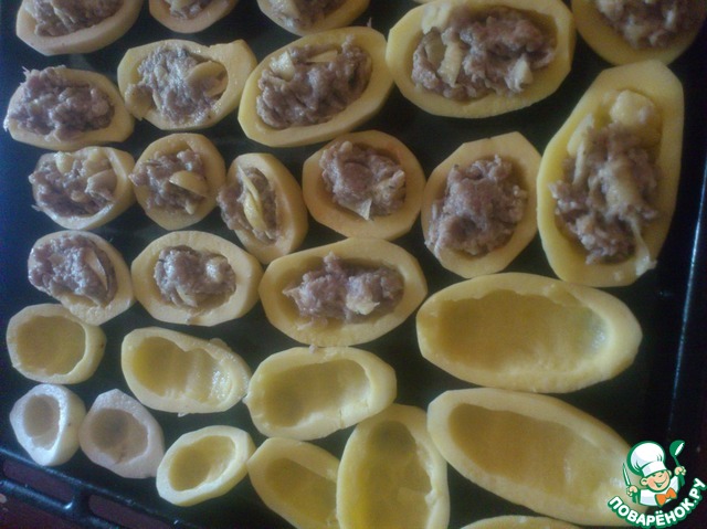 Чистим картофель, разрезаем вдоль, вырезаем серединку (формируем лодочки), при необходимости срезаем дно для устойчивости, выкладываем на противень, наполняем готовым фаршем