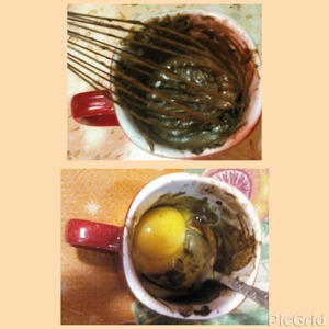 Смешиваем просеянную муку, сахар (можно прям в форме, в которой будем печь в микроволновке)