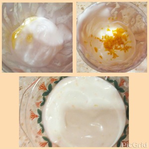 Глазомером делим на 3 части, в одну добавляем аккуратно сок (если боитесь, что опадут белки, можете не рисковать... у меня этот слой не самый "пышный", думаю из-за сока - вода ведь во взбитые белки не должна попадать) и цедру