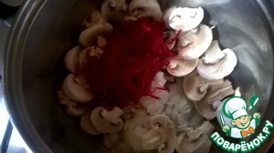 Лук и грибы мелко нарезать ( я резала крупно, потому что некоторые вредные члены моей семьи их не едят и для них грибы придётся вылавливать), свёклу натереть на мелкой тёрке. Добавить лимонный сок.