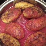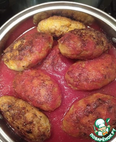 Утопить в нём котлеты и потушить 5-7мин. на слабом огне, периодически осторожно перемешивая. Выключить. Добавить мелко нарезанные чеснок и зелень. Дать настояться минут 15.
