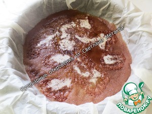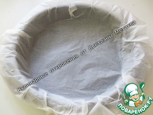 Форму застелить бумагой для выпечки (можно использовать любую: прямоугольную для хлеба или, как у меня, круглую 24 см)