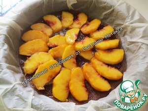 Очищенные персики разрезать на дольки и выложить в форму (здесь мы используем немягкие персики)