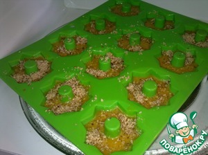 Разливаем тесто в силиконовые формочки (учитывая то, что тесто сильно поднимается), сверху посыпаем молотыми грецкими орехами.