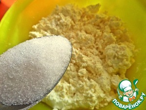 В творог любой жирности всыпаем сахар. Если готовите с изюмом, то достаточно 2 ст. л., но у меня ягода кислая, поэтому плюсуем ещё ложку!