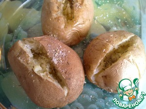 Достать картофель из микроволновки, сделать на нем надрезы, положить внутрь сливочное масло, соль, специи. Запекать еще 5 минут.