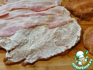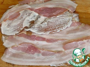 На один край выкладываем маленькие кусочки филе. Тоже сдабриваем сметаной, и накрываем беконом.