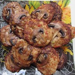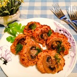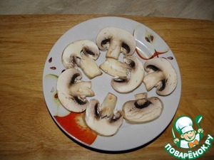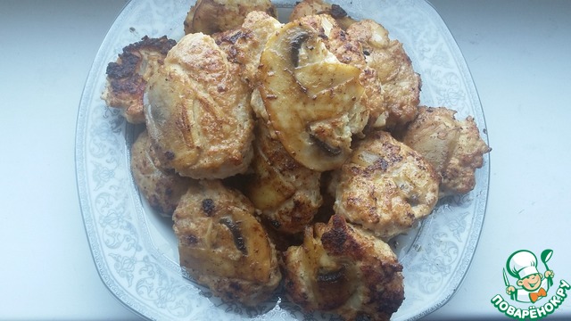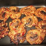Как только грибы перевернули, сразу ложкой выложить на каждый грибок куриный фарш, и разровнять.