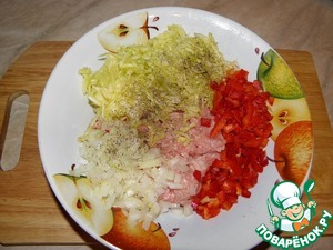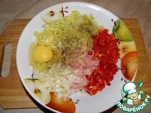 Овощи соединить с куриным фаршем, посолить, поперчить по вкусу.