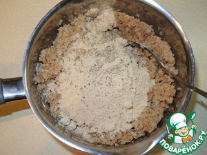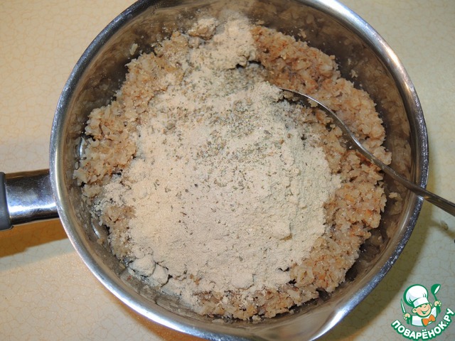 В распаренные хлопья добавить муку, специи и тщательно перемешать до однородности, доливая по необходимости горячую воду, чтобы масса получилась вязкой, но не жидкой.
