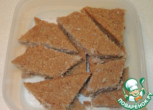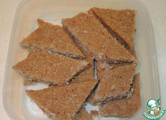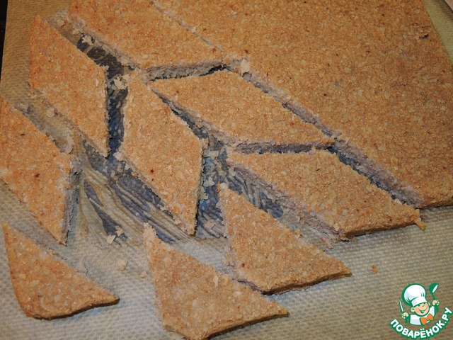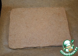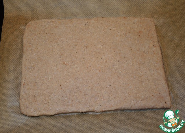 Выложить гречневую массу на противень, застеленный пергаментной бумагой, слоем в 1см. Запекать, точнее немного подсушить в духовке при 120 градусах 10 минут. Остудить.