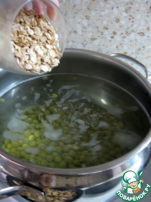 Тем временем нагреть бульон и добавить туда зеленый горошек. Дождаться кипения, и в кипящую воду добавить хлопья. Выключить огонь.