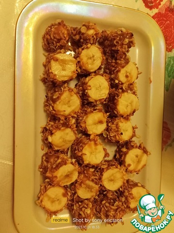 • Банан лучше взять немного незрелый (так сгущенка лучше ляжет). Аккуратно снимать с него кожуру по секторам и намазывать их вареной сгущенкой и присыпать рисовыми хлопьями.