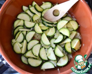 Добавить к луку нарезанные цуккини. Обжарить всё еще пару минут.