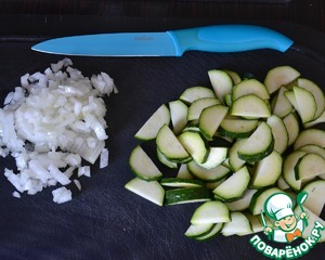 Сраху подготовить овощи: луковицу мелко нарезать, цуккини нарезать полукольцами (если крупный) или кружочками (если небольшой). -