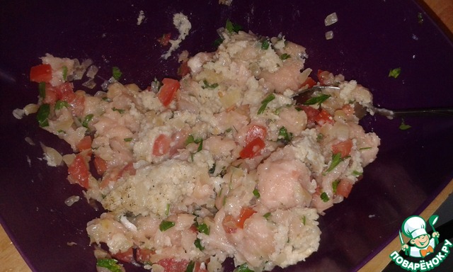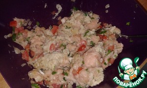 Куриное филе измельчить в блендере, лук мелко порезать и обжарить на растительном масле, помидор нарезать кубиками, петрушку мелко порубить