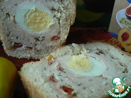 У хлеба срезать "крышечку" и удалить мякоть. Выложить половину мясной смеси, сверху уложить яйца