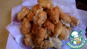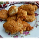 Курицу нарезать кусочками. Хорошо перемешать яйца с солью и перцем. Добавить порциями крахмал, тщательно размешать. Влить крахмал в курицу перемешать и оставить на 15-20мин.