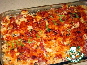 • Посыпать сыром (натереть на терке или порезать мелкими кубиками) и убрать еще минут на 20 в духовку (температуру понизить до 200*С).