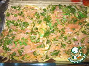После чего промыть под холодной водой и положить слой в форму для запекания (можно разрезать каждую полоску на две части, чтобы кусочки были меньше).