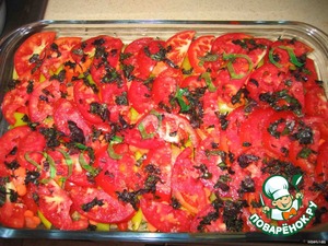 • Помидоры порезать полукольцами и положить слоем на морковку,