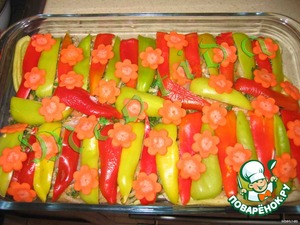• Перец очистить и порезать полосками, выложить ряд на курицу.