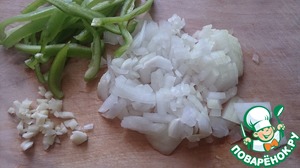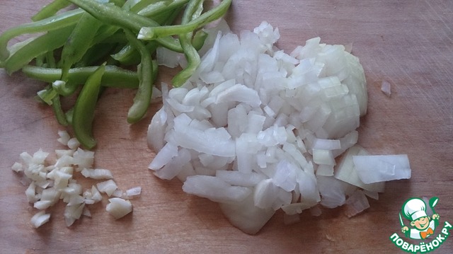 Лук и чеснок мелко нарезать ножом. Болгарский перец тонкими полосками.