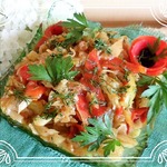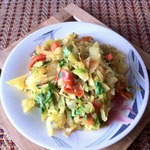 Добавить капусту и кусочки помидор. Посыпать сахаром, солью и карри. Влить воду и лимоный сок. Тушить 10 -15 минут, на среднем огне, периодически помешивая.