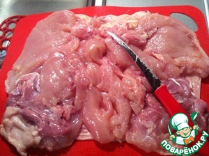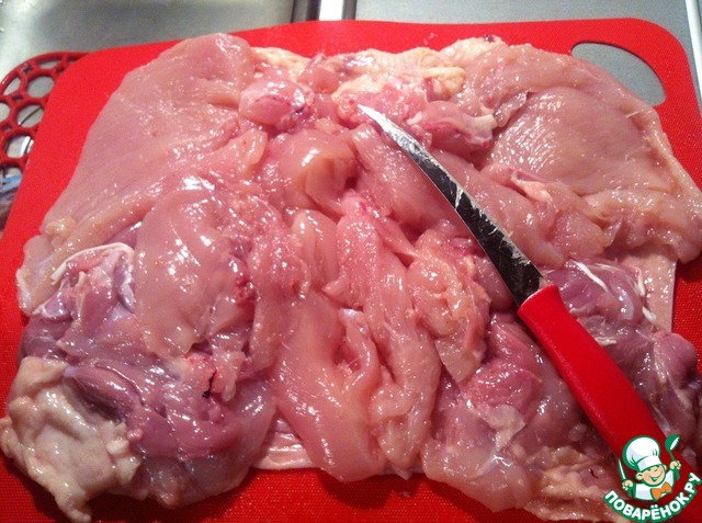 Курицу промыть, обсушить салфеткой. Разрезав вдоль по грудке удалить все косточки.