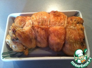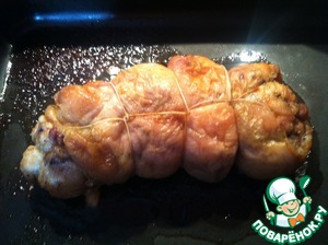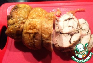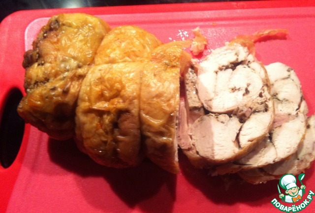 Запекать при температуре 200 градусов 45-50 мин. Выключить духовку. Дать потомиться рулету, оставив его еще на 10-15 мин в остывающей духовке.