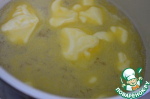 В кастрюлю налить воду, добавить сахар, перемешать и довести до кипения на среднем огне. Опустить сливочное масло и варить до тех пор пока масса не начнет густеть.