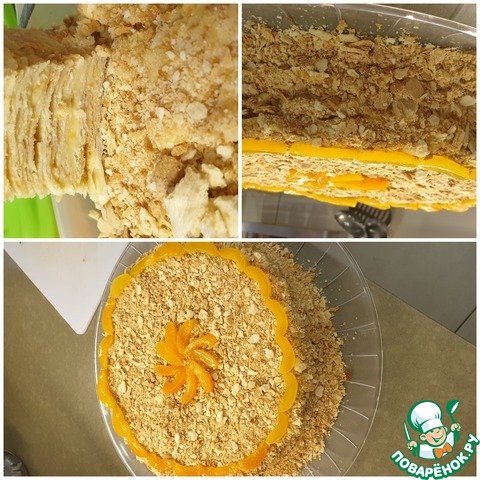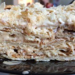 В тесто 1 ушло 200 гр.муки (крошка не собиралась) в тесто 2 ушло 400 гр.муки. Тесто очень хорошее и как говорят послушное, разделила на 16 частей, коржи получились маленькие надо или в 1.5-2 раза больше продуктов брать или на 8 частей разрезать. Раскатывать ровно не умею, но зато получилось очень тонко, на противен переносить было легко. В готовых коржах слои просматриваются и похожи на кольца Сатурна. Торт получился очень вкусным, слоистым и хрустящим. Мама когда попробовала сказала, ты превзошла меня, это был лучший комплимент. Буду готовить только так! Спасибо!