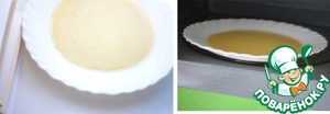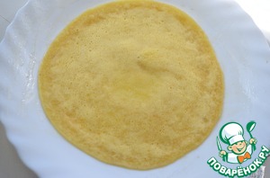 Десертную тарелку (тарелка должна быть плоской и тонкой) смазать маслом, смоченной в воде ложкой выложить на нее немного теста (2 ст. л.). Наклонив тарелку стараемся, чтобы тесто растеклось по ней тонким слоем.
