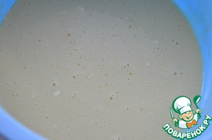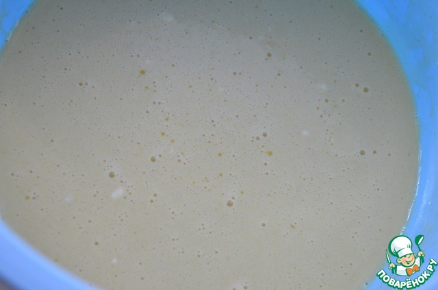 Всыпать просеянную муку и все хорошо размешать до получения однородного жидкого теста.