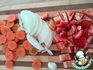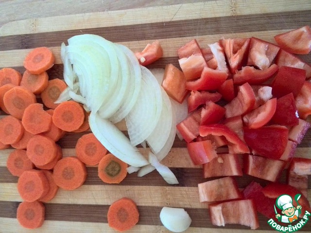 В то время пока тушится мясо подготавливаем овощи. Морковь почистить и нарезать кружочками, половинку средней луковицы нарезать полукольцами, перчик средними квадратиками, чеснок мелко порубить или пропустить через давилку.