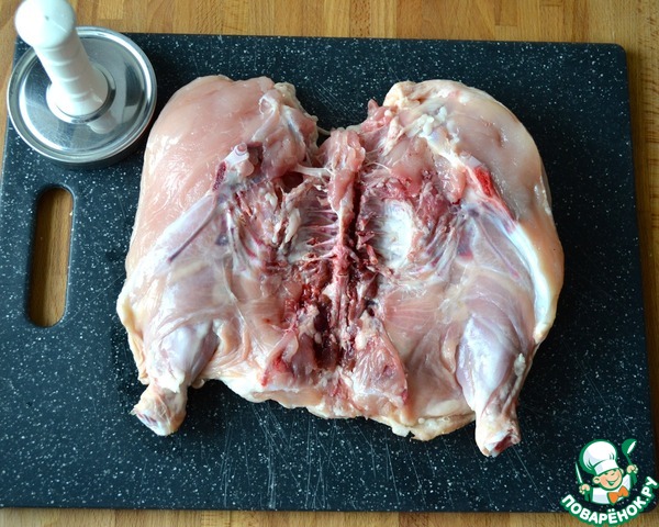 Разрезать ее с одной стороны (по грудке), чтобы разложить "бабочкой".
