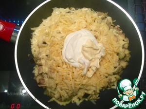 Теперь добавляем сметану и майонез, можно просто сметану, и тертый сыр. Да, прямо в сковороду! Я так подумала: скучно это, сыр сверху! Надо прям внутрь! Солим-перчим по вкусу!