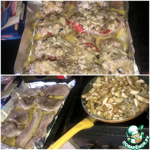 P.S. Лично я считаю, что секрет вкусного и сочного мяса состоит в том, чтобы не выкладывать сырые слои на сырое мясо, а именно вот такую вкуснющую готовую смесь сверху! Как только она даст сок, в духовке он тут же польется на картофель и мясо, что даст им просто фантастическую сочность и вкус! -