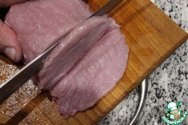 - Свинина (Корейка без кости и жира. В оригинальном рецепте говядина. В Швейцарии используются специальные мясные сорта говядины (а-ля мраморная), а наши коровки дают много молока, за сим предлагаю отечественный заменитель.) — 300 г