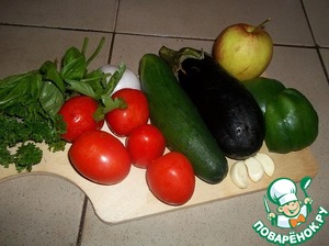 Наши продукты. Все овощи небольшие по размеру. Помидоры нарезать крупными кусочками, лук и чеснок произвольно. Баклажаны, огурец, яблоко, болгарский перец довольно крупными кубиками. Мелко нарезать перец чили.