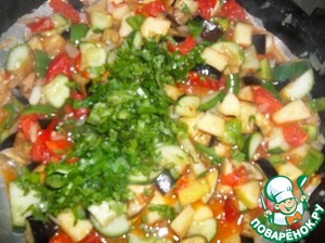 Добавить баклажаны, перец, огурец, яблоко и мелко рубленную зелень. Тушить, на среднем огне не более 5 минут, добавить сахар, уксус, соль, перец чили и специи. Все перемешать. Оставить на огне примерно 3 минуты, салат готов. Остывший салат уложить в чистую банку и хранить в холодильнике не более недели.