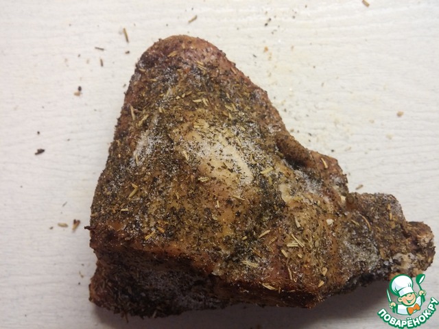 Окорок свинины, запекается в духовке под панцирем из крупной соли и трав.