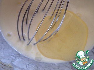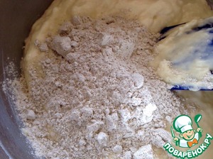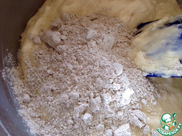 Муку просеять с разрыхлителем. И в 2-3 приема подмешать к жидкой массе! Я взяла 100 пшеничной муки и 40 ржаной, но можно сделать и пополам! Консистенция теста-густая сметана! По необходимости, можно еще добавить муки!