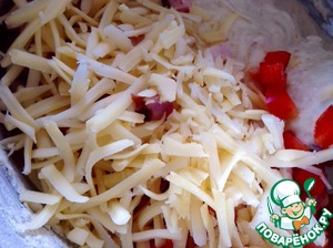 Для начинки: сыр натереть на крупной терке, бекон и перец нарезать не большими кубиками.