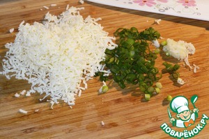 Натереть на мелкой терке сыр. Зелень и чеснок измельчить.