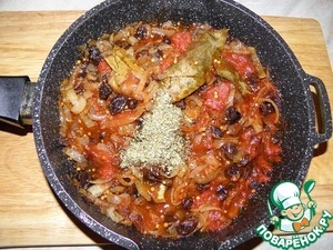 Далее добавить помидоры, горчицу, сахар и уксус ( соль по вкусу), все остальные специи, кроме майорана! Долить чуть воды. и потушить 3-4 минуты.